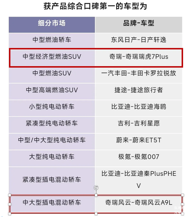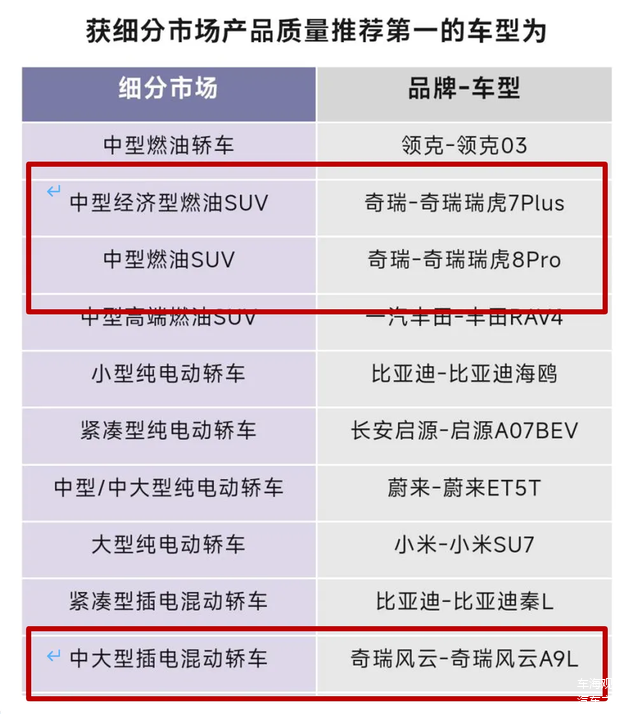 在具体车型榜单中,奇瑞多款主力产品表现亮眼,实现 “油电双开花”。其中,风云 A9L作为奇瑞插电混动领域的重磅车型,凭借在动力性能、续航能力、智能科技与制造工艺上的全面突破,一举拿下中大型插电混动轿车产品质量推荐第一与产品综合口碑第一双项桂冠,印证了其在新能源领域的技术实力与市场认可度;瑞虎 7 PLUS则在竞争激烈的中型经济型燃油 SUV 市场中脱颖而出,同时斩获产品质量推荐第一与综合口碑第一,彰显了其在空间、动力、性价比等核心维度的突出优势;瑞虎 8PRO同样表现不俗,成功登顶中型燃油 SUV 产品质量推荐第一,进一步巩固了奇瑞在 SUV 市场的领先地位。