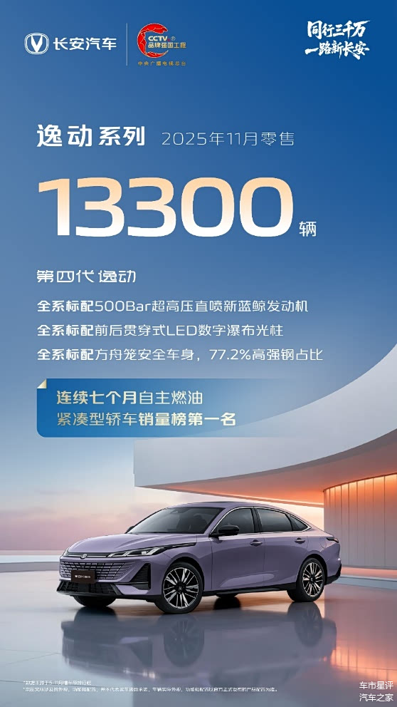 12月初,长安汽车发布最新销量数据显示,逸动系列11月零售13,300辆,连续第七个月蝉联自主品牌紧凑型燃油轿车销量冠军,稳居细分市场榜首。其持续的强势表现,不仅印证了“国民家轿”在智能化与综合实力全面进阶后的蓬勃生命力,更以坚实的市场基盘,为12月10日“中国长安成为最快达成中国品牌3000万辆的汽车企业”这一里程碑,贡献了重要力量。