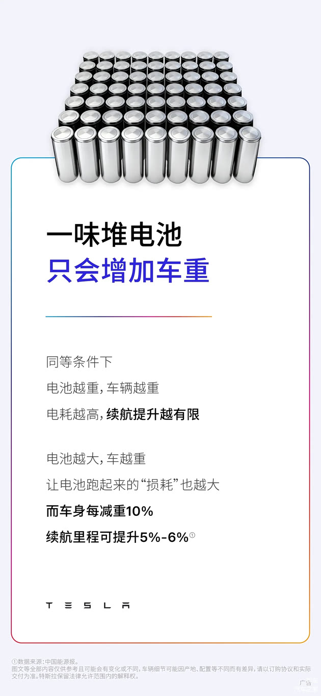 第二点,特斯拉称“一味堆电池,只会增加车重”。同等条件下,电池越重,车辆越重,电耗越高,续航提升越有限,而车身每减重10%,续航里程可提升5%-6%,一些车堆100度电池,比Model 3重几百斤,续航也没超过Model 3,一些车比Model Y重1000+斤,续航不如Model Y,一些车比 Model Y L重1000斤,续航比Model Y L少100+公里。