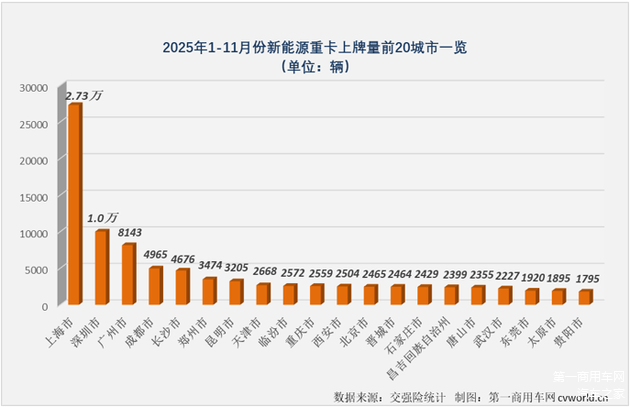 2025年1-11月,全国31个省(市、区)都有新能源重卡上牌。具体到城市来看,截止到11月份,今年全国已有326座城市有新能源重卡上牌(11月新增2城),其中上海、深圳、广州、成都、长沙、郑州、昆明、天津、西安、昌吉、石家庄、临汾、晋城、北京和重庆等17座城市上牌量已超过2000辆,上牌量超过4000辆的城市都有5座(如下图)。