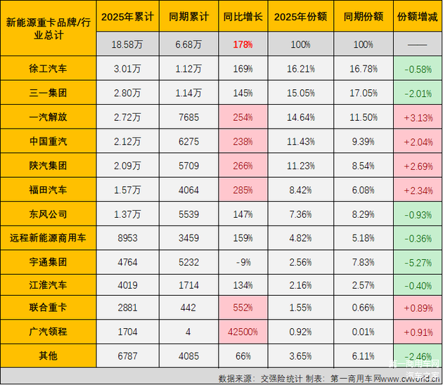 上表可见,2025年1-11月份,新能源重卡累计销售18.58万辆,同比累计增长178%,累计增幅与10月过后持平。具体到新能源重卡生产企业来看,大多数企业都实现翻倍增长。这其中,解放、重汽、陕汽、福田和联合重卡等企业,1-11月累计销量同比分别大增了254%、238%、266%、285%和552%,实现翻倍增长的同时也跑赢1-11月新能源重卡市场“大盘”,广汽领程去年11月份才开始销售新能源重卡,同期基数太低,同比暴涨了42500%。