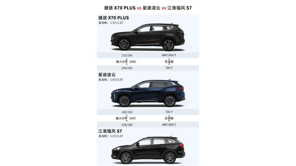 - 捷途X70 PLUS:1.5T/1.6T发动机(115-145kW),匹配6MT/6DCT变速箱,日常够用,手动自动任选
