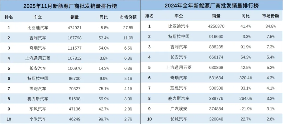据乘联会公布的各大车企11月新能源销量数据,奇瑞汽车凭借111,577辆的成绩进入新能源销量榜前三,同比增长54%,相较2024年接连超越特斯拉、长安和上汽通用五菱,仅次于比亚迪和吉利。在风云、纵横等品牌的拉动下,奇瑞汽车有望在明年更进一步。(新能源销量官方口径和乘联会数据不同)