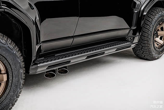 来到车侧,Wald 换上与车身同色、爆龟造型的轮弧,视觉上与车身钣件无接缝的设计,让整体的操控运动视觉感更加提升,同时轮弧还设计有导风口;胎圈方面,换上 offset 更大的轮圈,并将原本的公路胎改为 AT 全地形胎款。