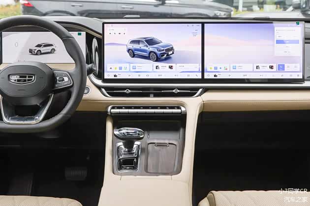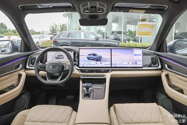 内饰设计部分,2026款吉利星越L全新东方曜内饰布局给人一种豪华与科技并存的感觉:大面积的皮质软包覆盖+中控台4屏联动(12.3英寸液晶仪表+25.6英寸HUD抬头显示系统+中控与副驾双14.6英寸连屏)、2种内饰配色方案【标配“韶华杏”内饰,可选装“鸣沙流金”环保麂皮内饰】。