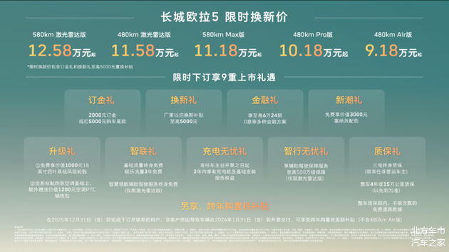【中国·保定】2025年12月16日——今日,长城汽车欧拉品牌全新A级纯电SUV——长城欧拉5正式上市。新车共推出5款配置,建议零售价区间为 9.98万至13.38万元,限时换新价9.18万元起(限时换新价包含“订金礼”和“换新礼”至高5000元以旧换新补贴)。为回馈广大用户的热爱与支持,即日起至2025年12月31日,用户下订并锁单即可尊享包含订金礼、换新礼、智行无忧礼在内的9重上市好礼,以及跨年购置税补贴(不含480km Air版)等丰厚购车权益。凭借诚意十足的价格权益与越级产品力,长城欧拉5致力于成为全球年轻用户的“严选搭子”。