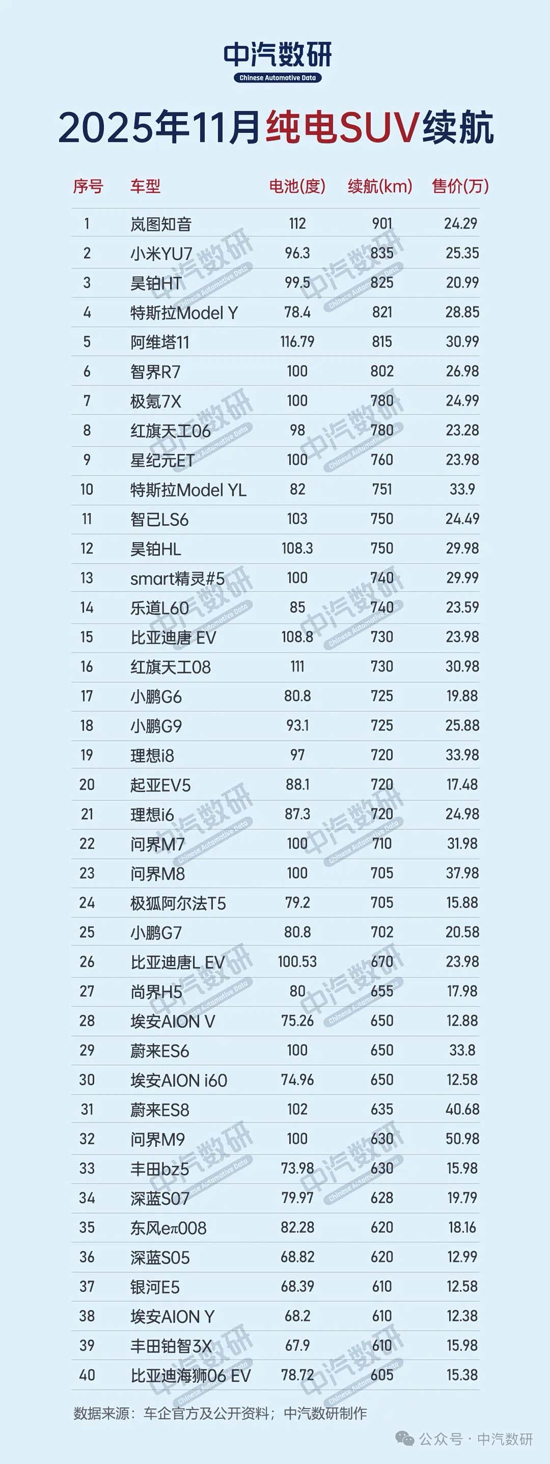 纯电SUV续航排行榜,特斯拉两款SUV都是小电池长续航
