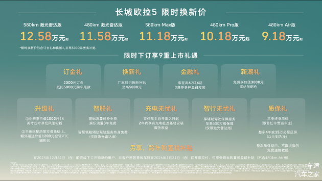 【中国·保定】2025年12月16日——今日,长城汽车欧拉品牌全新A级纯电SUV——长城欧拉5正式上市。新车共推出5款配置,建议零售价区间为 9.98万至13.38万元,限时换新价9.18万元起(限时换新价包含“订金礼”和“换新礼”至高5000元以旧换新补贴)。为回馈广大用户的热爱与支持,即日起至2025年12月31日,用户下订并锁单即可尊享包含订金礼、换新礼、智行无忧礼在内的9重上市好礼,以及跨年购置税补贴(不含480km Air版)等丰厚购车权益。凭借诚意十足的价格权益与越级产品力,长城欧拉5致力于成为全球年轻用户的“严选搭子”。