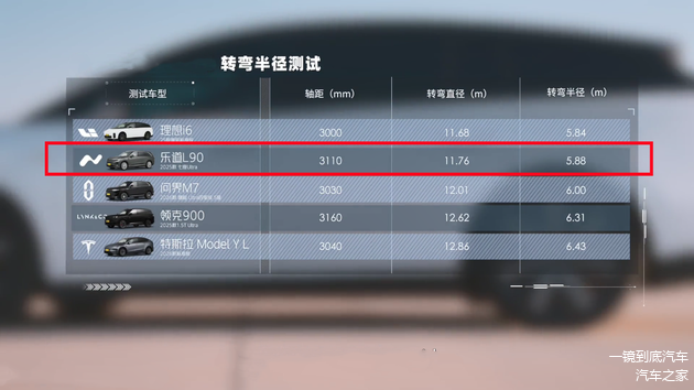 而在转弯半径的测试中,理想i6轴距为3000毫米,测试中转弯半径为5.84米,由于在测试的车型中,理想i6轴距相对较短,所以这个成绩倒也不意外。而乐道L90在测试中,转弯半径为5.88米,仅次于理想i6,差距仅4cm,要知道这台乐道L90可是7座布局,轴距可有3110毫米,光轴距就比理想i6多了110毫米,牺牲了大概两指半的转弯半径,却换来车内多一排座椅,这买卖我觉得挺划算!