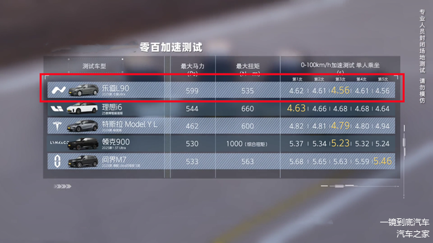 而在零百加速中,乐道L90获得了零百加速4.56秒的成绩,要知道测试的乐道L90可是一台7座车型,车子搭载了双电机四驱系统,爆599马力,扭矩设计到535N·m,加速响应及时,几乎没有延迟。而测试的理想i6,搭载544马力电动机,扭矩设计到660N·m,零百加速时间,4.63秒,作为一台中大型SUV,能做到这样的加速成绩已经很不错了,不过相比之下,乐道L90的零百加速能力更强。