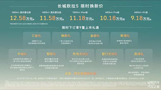 12月16日,长城欧拉5正式上市。新车共推出5款配置,官方指导价区间为9.98万至13.38万元,同时推出限时换新价,9.18万元起。在上市期间,用户下订并完成锁单,可享受包括订金礼、换新礼在内的多项购车政策,以旧换新补贴至高5000元,部分版本还提供跨年购置税补贴及“智行无忧礼”等权益,整体购车门槛进一步降低。