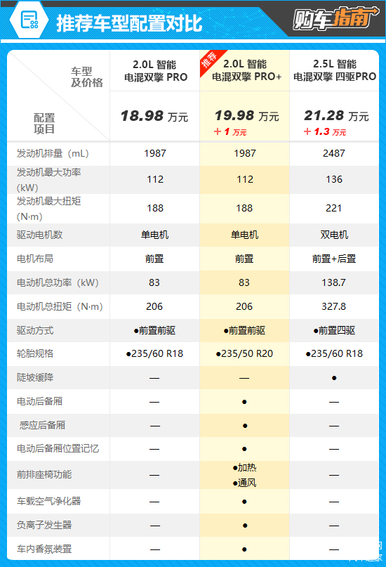 推荐车型为2.0L智能电混双擎PRO+,售价19.98万元。相较低一个配置的2.0L智能电混双擎PRO,虽然动力配置并无任何差异,但是轮毂尺寸由18英寸升级为20英寸,并且还增加了电动后备厢、车载空气净化器、负离子发生器、前排座椅通风/加热功能等。综上所述,再结合1万元的差价来看,绝对算是物有所值。