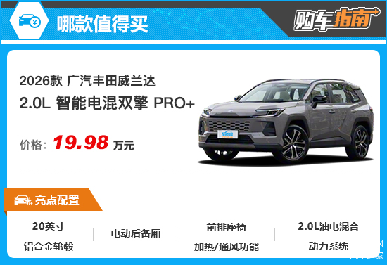 综上所述,对于2026款广汽丰田威兰达车型,售价19.98万元的2.0L智能电混双擎PRO+价比相对更高,超配换购价18.98万元,消费者在选购时可以优先考虑。