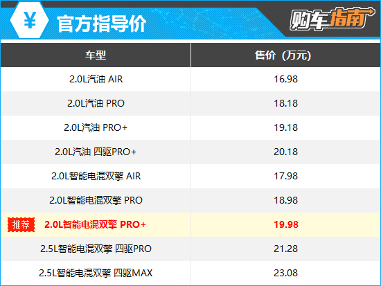 2.5L智能电混双擎PRO+售价21.28万元,相较推荐车型贵了1.3万元,除动力系统外,配置表现与2.0L智能电混双擎PRO基本保持一致。如果想要兼得更强的动力以及更为丰富的配置,那么就只剩下顶配版本的2.5L智能电混双擎四驱MAX可选,然而其售价也来到了23.08万元,个人感觉并不划算。
