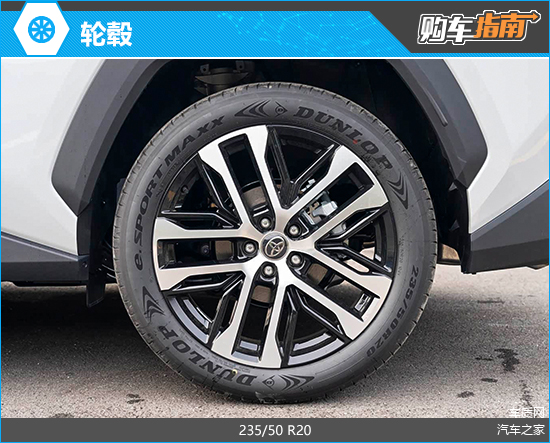 2026款广汽丰田威兰达提供两种轮毂尺寸,18英寸铝合金轮毂并未找到实拍照片,轮胎规格为235/60 R18;20英寸铝合金轮毂采用双五辐式设计,造型动感前卫,轮胎规格为235/50 R20。