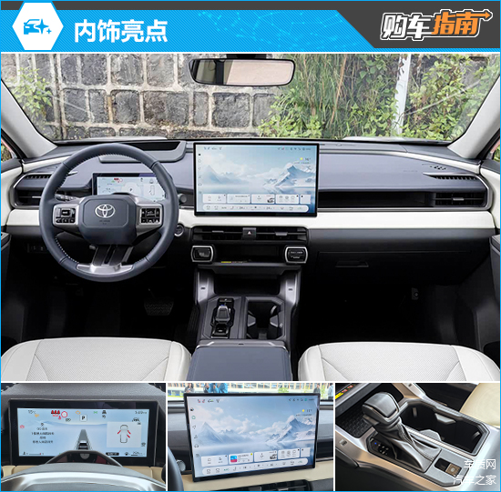 内饰布局简约规整,座舱由丰田中国团队自研打造,细节设计更加符合中国用户的使用习惯。8.8英寸全液晶仪表为全系标配,根据配置不同,中控屏尺寸分为14英寸和15.6英寸两个版本,后者还配备了高通骁龙8155P芯片。语音控制系统集成丰田首个语言大模型,能够为用户带来更好的交互体验,此外,车机系统还支持CarPlay、HUAWEI HiCar、Carlink手机互联。