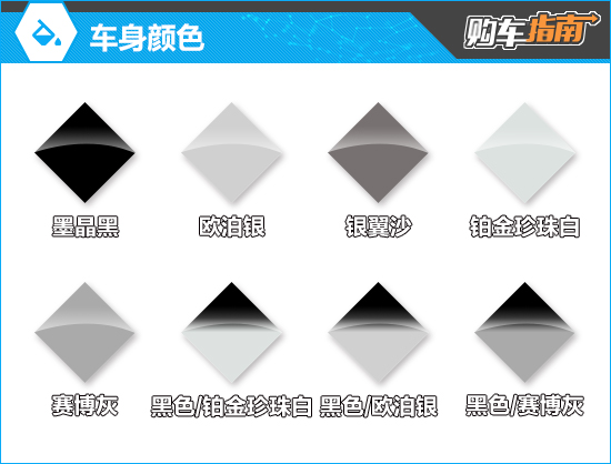 新车提供8种车身颜色可选,其中铂金珍珠白、赛博灰、黑色/欧泊银双色需要花费2000元进行选装;除此之外,黑色/铂金珍珠白和黑色/赛博灰双色也需要通过选装才能得到,价格提升至4000元。如果没有特殊喜好需求,我个人还是更加推荐墨晶黑、欧泊银和银翼沙这3种免费的车身颜色,性价比较高。
