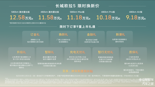 2025年12月16日,长城汽车欧拉品牌全新A级纯电SUV——长城欧拉5正式上市。新车共推出5款配置,建议零售价区间为 9.98万至13.38万元,限时换新价9.18万元起(限时换新价包含“订金礼”和“换新礼”至高5000元以旧换新补贴)。为回馈广大用户的热爱与支持,即日起至2025年12月31日,用户下订并锁单即可尊享包含订金礼、换新礼、智行无忧礼在内的9重上市好礼,以及跨年购置税补贴(不含480km Air版)等丰厚购车权益。凭借诚意十足的价格权益与越级产品力,长城欧拉5致力于成为全球年轻用户的“严选搭子”。