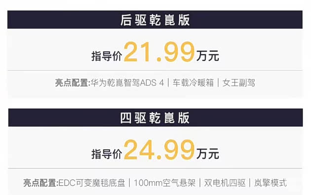 你可以看到,最新款岚图FREE+的售价是21.99-27.99万元,其中,最低配售价21.99万元的后驱乾崑版它也拥有华为乾崑智驾ADS 4、鸿蒙座舱5、车载冷暖箱以及女王副驾等一系列的配置,不愧“满配华系SUV”之称。