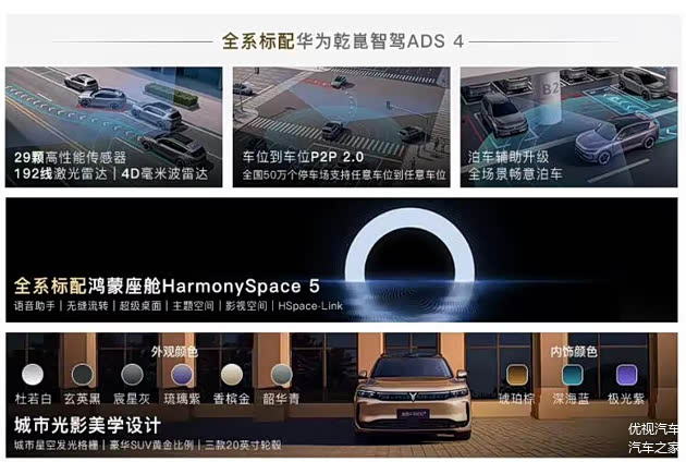 再有就是,限时免费配置升级的服务。其中就包括了价值18000元的高阶额皮质(四活塞运动卡钳+主副驾双头枕音响+四门电吸门)和价值20000元的华为乾崑智驾ADS高阶功能抵用券,力求让消费者都能买到更高价值的满配华系SUV。