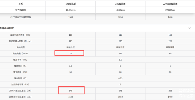 HS6 PHEV一共有三个配置,没有为难选择困难症,每一级相差两到三万,主要差在电池容量、动力以及舒适配置上。电池都是磷酸铁锂,容量有23度和40度两种,前者是入门版独享。动力除了顶配是前后双电机之外,其他两个都是前置电驱。至于舒适配置,无非是座椅的通风加热之类。