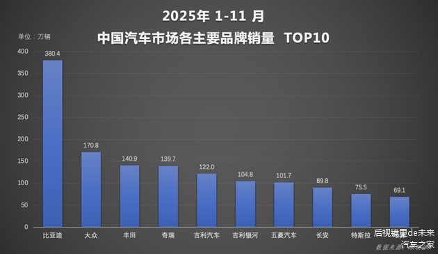 从累计数据看,2025年前11个月比亚迪累计销量418.2万辆,同比增长11.3%,年度销量目标完成率超九成。随着12月市场进入冲刺阶段,比亚迪有望超额完成全年目标。