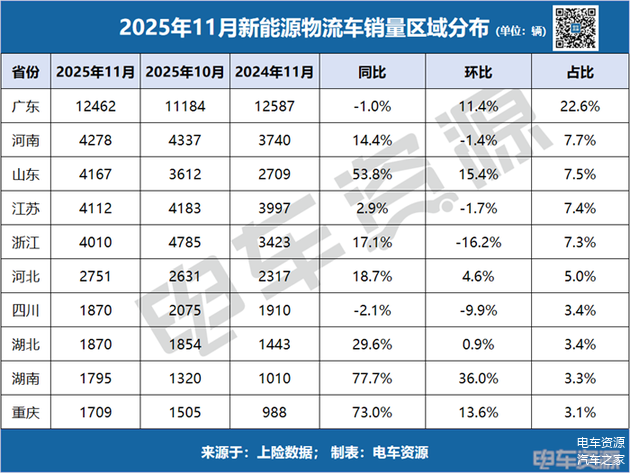 11月区域销量分布呈现鲜明的“核心引领、多点爆发”特征。广东省以12462辆的销量继续领跑全国,全国占比22.6%,作为物流枢纽和新能源政策高地,其市场渗透率已达较高水平。除广东外,河南(4278辆)、山东(4167辆)、江苏(4112辆)、浙江(4010辆)构成第二梯队,四省销量均突破4000辆,成为支撑市场的重要力量。