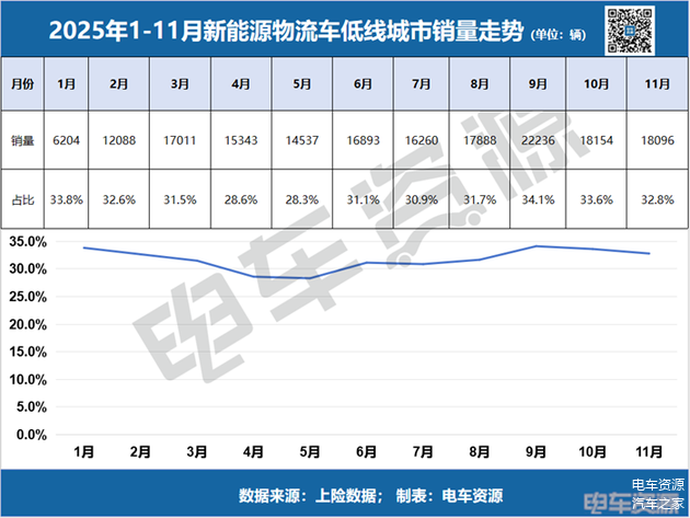 综合来看,低线城市已成为新能源物流车市场增长最稳定的基本盘。1-11月,其销量从1月的6204辆攀升至11月的18956辆,规模扩张超三倍,且月度销量占比始终稳固在30%以上,9月更达34.1%的峰值。这一持续而强劲的增长曲线,印证了市场下沉的确定性趋势——增量之战,已在广袤的下沉市场全面展开。