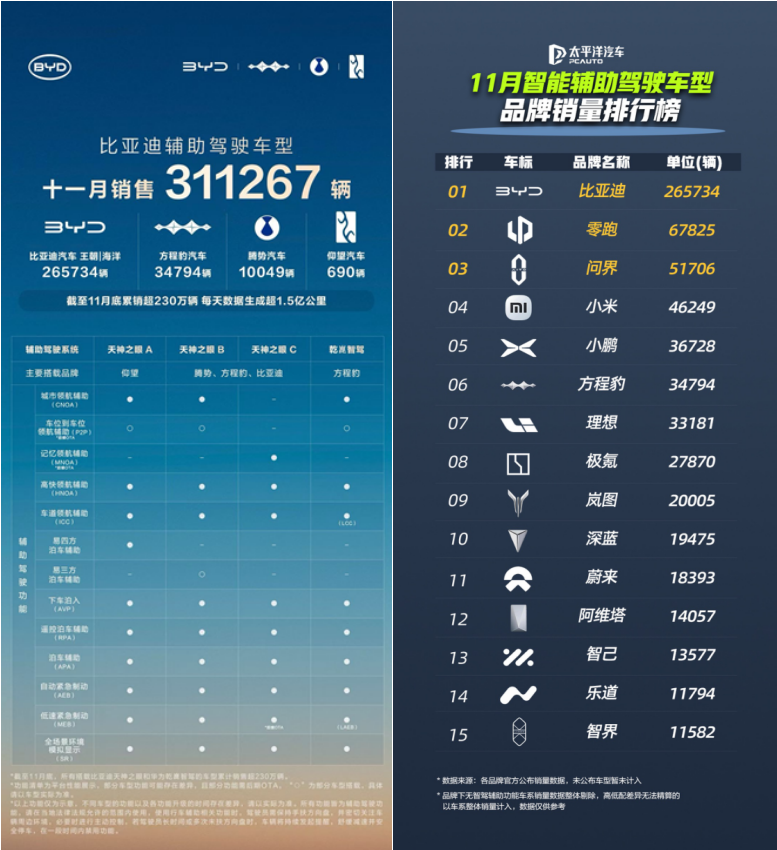 谁的智驾更好用?肯定是比亚迪的!因为比亚迪搭载智驾的车型11月的销售数据,达311267辆。 每日生成的辅助驾驶数据已超过1.5亿公里,海量数据构筑技术护城河。行业领先的数据底座,为AI大模型的持续训练与快速迭代提供了坚实基础。通过端到端强化学习等先进算法,系统能不断学习进化,使辅助驾驶行为更拟人、更安全,用户体验实现“越用越好用”。