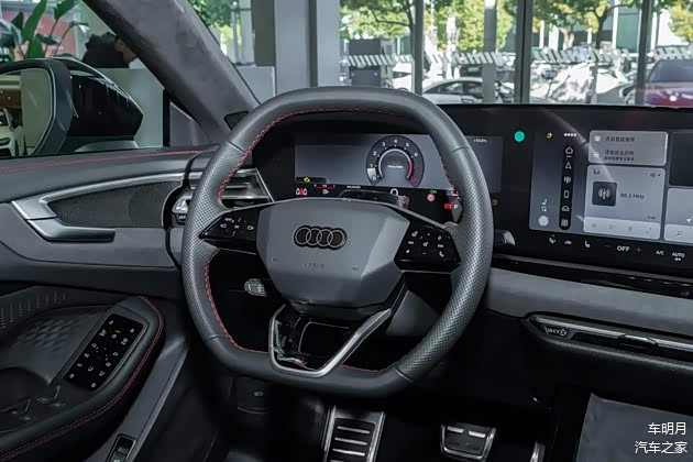 车辆内部装饰主要使用了红色的设计元素,如方向盘和座椅等,都是通过红色的缝线来描绘的。座椅采用了Microfiber超纤绒和Laedana超纤皮的双拼材料,车顶也同样使用了Microfiber超纤绒,并搭配了竞速碳纤维饰板,以增强内饰的质感和运动氛围。11.9英寸的液晶显示设备与14.5英寸的中央控制屏幕共同构成了一个曲面的双联屏,整个系列都默认配备了10.9英寸的副驾驶显示屏,并且支持无线CarPlay/Android Auto互联技术。从空间角度看,以小编1.8米的身高来看,坐在轿跑车型上时膝盖还能有两拳的余量,头部的空间也足以支撑大约一拳,这打破了轿跑车型“空间受限”的传统观念。此外,这款车还搭载了Bang&Olufsen 3D环绕音响系统、Bang&Olufsen的前端枕音响设备、光境氛围灯以及掀背式的后备箱。