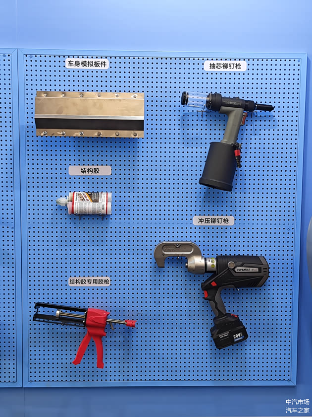 新能源汽车的车身革命,直接将钣喷维修推入技术深水区,为实现轻量化,大面积铝合金外板已成为高端新能源车型的标配。但这类材质组合给维修带来了天然难题:铝合金熔点低、易龟裂、钢铝连接易腐蚀,许多传统的工艺近乎失效。问界原厂售后采用航空级的胶粘铆接工艺,规避传统焊接易腐蚀、强度不足的痛点,能实现维修后的连接强度不低于出厂标准。在现场工具展示区,各种不同类型的铆钉清晰可见:车身制造阶段的SPR铆钉,在售后维修时会替换为FFR流式铆钉,再搭配抽芯铆钉、原厂FDS自熔螺丝钉等专用连接件,可全面覆盖结构维修的全场景需求。
