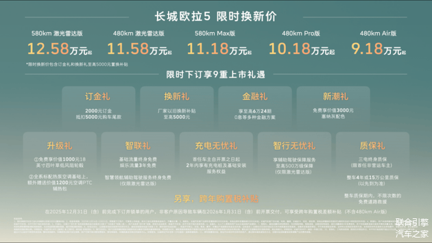12月16日,定位为“年轻人的严选搭子”的 欧拉5正式上市。新车先期推出5款纯电版配置车型,建议零售价区间为9.98—13.38万元,并同步给出限时换新价9.18万元起,包含最高5000元以旧换新补贴。与此同时,官方还推出覆盖订金礼、换新礼、智行无忧礼在内的9重上市好礼,并提供跨年购置税补贴(不含480km Air版),在价格与权益层面展现出较高诚意。