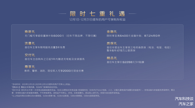 首先,从最直接的购车经济性来看,2026款银河E5的定价策略本身就颇具吸引力。其官方指导价区间为10.98万元至14.58万元,共提供五个配置版本,分别对应530公里和610公里两种续航选择。这意味着,用户可以用主流A级车的预算,获得一台续航扎实的纯电SUV。更重要的是,在12月31日前下订,一系列限时权益将显著降低实际拥有门槛:无门槛的6000元置换补贴、至高6400元的金融补贴(其中包含8万元24期0息方案),能直接减轻购车时的资金压力。对于教师、警察等职业用户,还有额外的2000元尊享礼遇。这种“入门价”与“优惠礼”的组合,首先在“省钱”层面建立了优势。