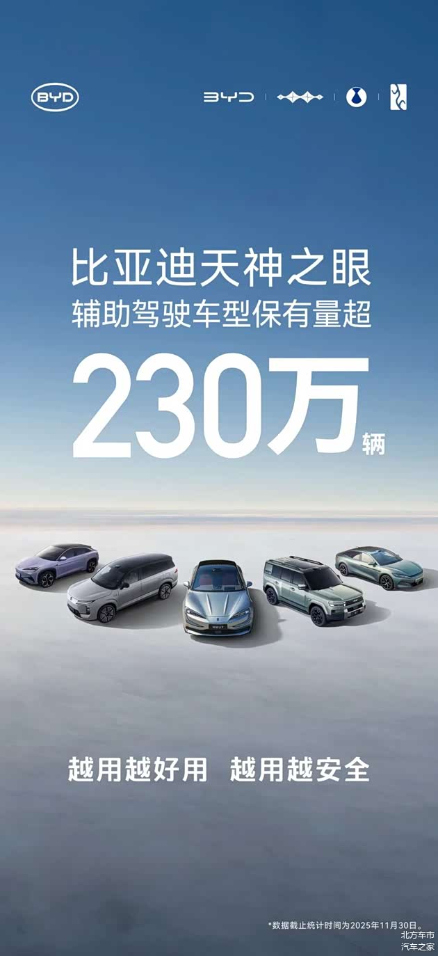 数据显示,截至2025年11月底,比亚迪搭载“天神之眼”驾驶辅助系统的车型累计销量已突破230万辆,持续蝉联中国辅助驾驶车型销量及系统装车量榜首。这标志着比亚迪推动的“全民智驾”战略已取得显著成效,智能驾驶正从高端配置加速向主流市场普及。