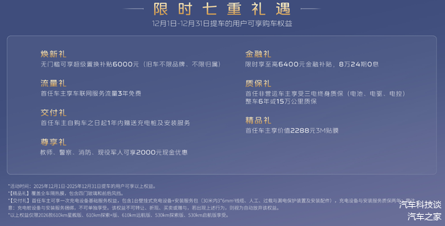 用车成本亲民,长期使用更省心除了亲民的售价,26款银河E5在用车成本上也极具优势。百公里电耗低至11.9kWh,按居民用电均价计算,每公里成本仅几分钱,远低于燃油车。首任非营运车主还可享受三电终身质保,整车6年或15万公里质保,从根源上降低后期维修顾虑。限时推出的七重购车礼遇更是诚意满满,6000元不限品牌置换补贴、至高6400元金融补贴、8万24期0息方案,大幅降低购车门槛;免费充电桩及安装服务、3年免费车联网流量,让用车全程省钱又省心。