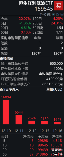 恒生红利低波ETF(159545)紧密跟踪恒生港股通高股息低波动指数,该基金备受资金关注,近5日资金净流入超2.9亿,近10日资金净流入近10亿,近20日资金净流入近20亿。