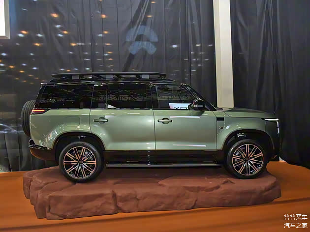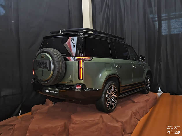 新车侧面的贯穿式腰线平直、立体,车身上半部分整体采用熏黑设计,多辐式轮圈更具视觉张力,尾部搭配了外挂式备胎,采用硬派SUV常用的竖状尾灯,尾门的开启方式为侧开式。