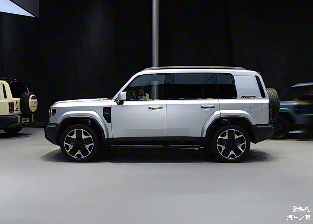 车身侧面造型轮廓方正,车顶以及车窗的线条很平直,车身同色的D柱造型很宽厚,下部还带有车型标识,有着很高的辨识度。外扩式的轮眉采用了双层结构,上部为车身同色涂装。尺寸方面,其长宽高分别为4909(5055)/x1976x1855/1894(带行李架)mm,轴距2910mm。