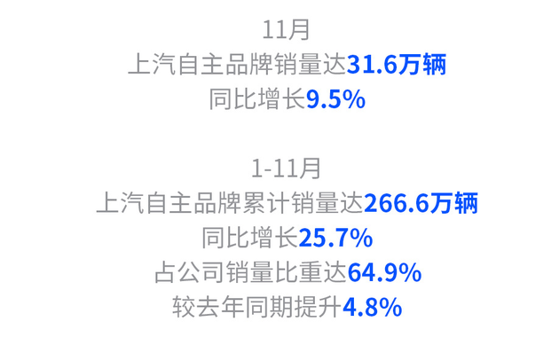 今年1-11月,上汽自主品牌销售266.6万辆,同比增长25.7%,占集团总销量的比重达到64.9%。这意味着如今上汽每卖出10辆车,超过6辆是自主品牌。