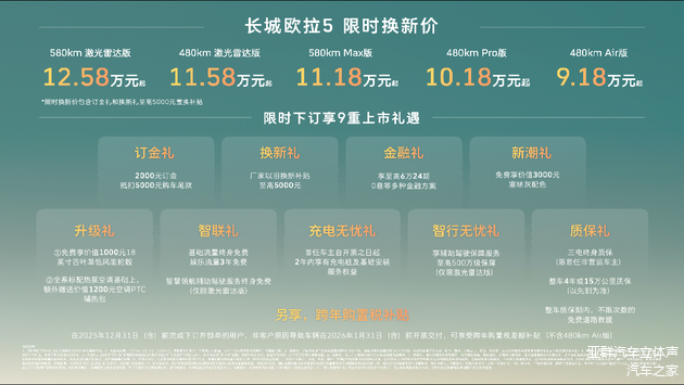 2025年12月16日——今日,长城汽车欧拉品牌全新A级纯电SUV——长城欧拉5正式上市。新车共推出5款配置,建议零售价区间为 9.98万至13.38万元,限时换新价9.18万元起(限时换新价包含“订金礼”和“换新礼”至高5000元以旧换新补贴)。为回馈广大用户的热爱与支持,即日起至2025年12月31日,用户下订并锁单即可尊享包含订金礼、换新礼、智行无忧礼在内的9重上市好礼,以及跨年购置税补贴(不含480km Air版)等丰厚购车权益。凭借诚意十足的价格权益与越级产品力,长城欧拉5致力于成为全球年轻用户的“严选搭子”。