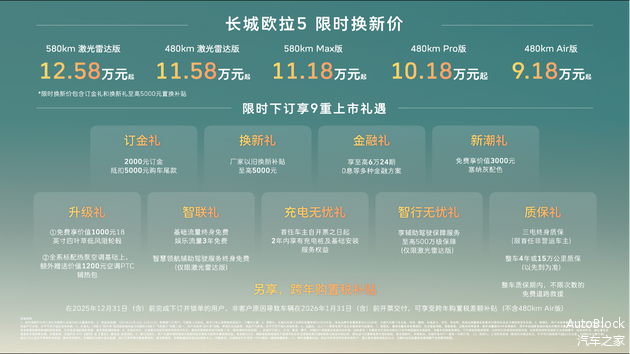 长城汽车欧拉品牌全新A级纯电SUV——长城欧拉5正式上市。新车共推出5款配置,建议零售价区间为 9.98万至13.38万元,限时换新价9.18万元起。
