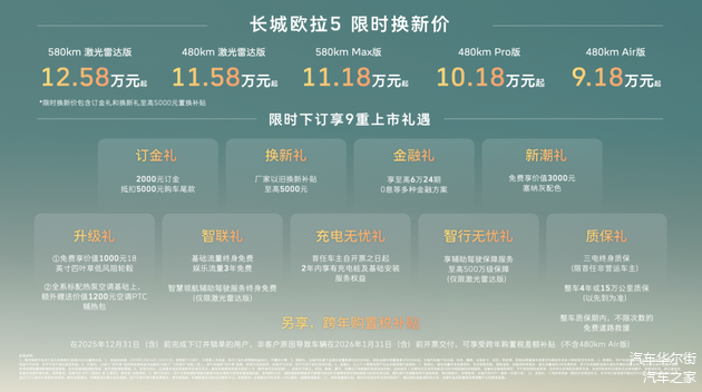 2025年12月16日,长城汽车欧拉品牌全新A级纯电SUV——长城欧拉5正式上市。新车共推出5款配置,建议零售价区间为 9.98万至13.38万元,限时换新价9.18万元起(限时换新价包含“订金礼”和“换新礼”至高5000元以旧换新补贴)。为回馈广大用户的热爱与支持,即日起至2025年12月31日,用户下订并锁单即可尊享包含订金礼、换新礼、智行无忧礼在内的9重上市好礼,以及跨年购置税补贴(不含480km Air版)等丰厚购车权益。凭借诚意十足的价格权益与越级产品力,长城欧拉5致力于成为全球年轻用户的“严选搭子”。