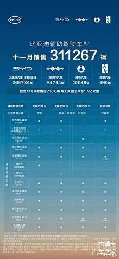 近日,比亚迪公布了其搭载天神之眼辅助驾驶系统的车型在11月的销售数据,全月销量达311267辆,继续引领市场。其中,比亚迪王朝与海洋系列贡献265734辆,方程豹、腾势、仰望等高端及个性化品牌亦表现稳健,共同构筑了比亚迪在智能驾驶领域的强大产品矩阵。