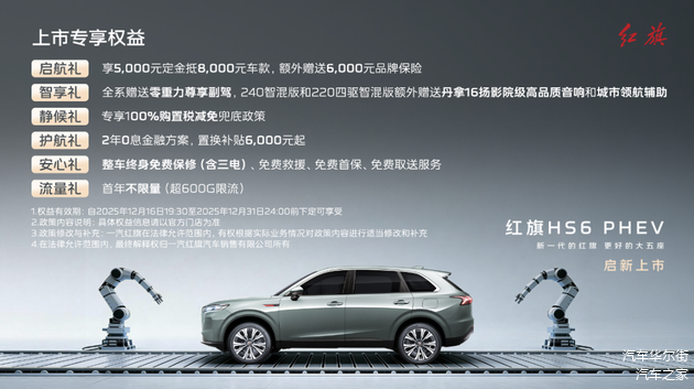 从一道道精密的工艺,到一项项严苛的测试,红旗HS6 PHEV以全新的产品理念、全维的技术突破和全程的品质把控,兑现了“新一代的红旗,更好的大五座”承诺。新车承袭国车对品质与安全的极致追求,以17.88万元起售的价格,将一汽红旗对家的理解与关怀,转化为切实可感的获得感,让红旗HS6 PHEV成为一汽红旗在新能源时代交给中国家庭的诚意之作。