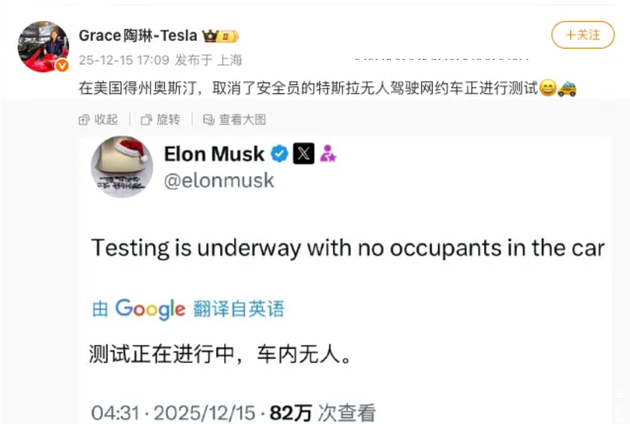 在官方确认之前,已有海外博主拍摄到Model Y Robotaxi在公共道路行驶的画面。视频中车辆前排与后排均处于空置状态,方向盘无人接管,副驾未配置监控人员。随后,马斯克本人也确认,这批Robotaxi并未设置安全员。