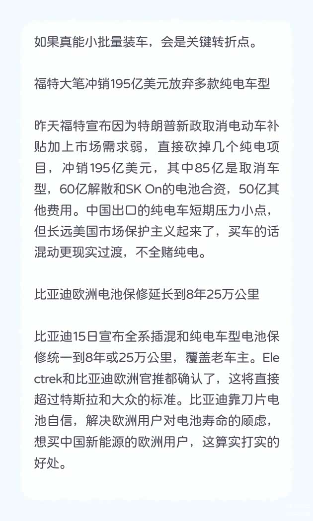 昨天福特宣布因为特朗普新政取消电动车补贴加上市场需求弱,直接砍掉几个纯电项目,冲销195亿美元,其中85亿是取消车型,60亿解散和SK On的电池合资,50亿其他费用。中国出口的纯电车短期压力小点,但长远美国市场保护主义起来了,买车的话混动更现实过渡,不全赌纯电。