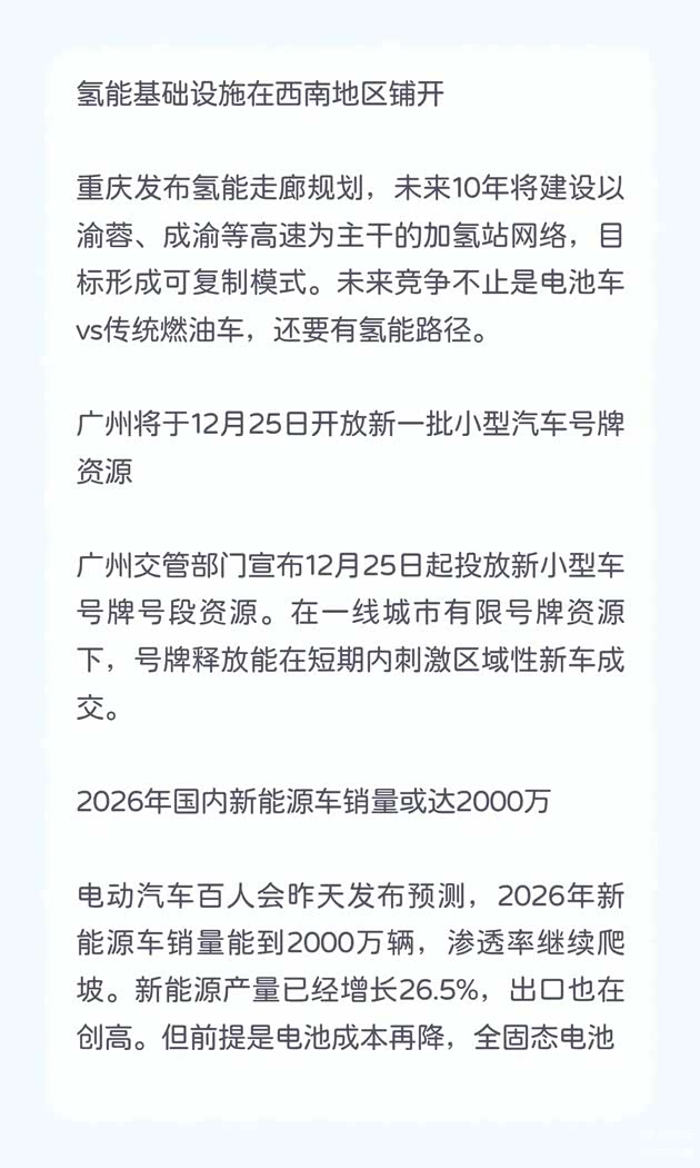 重庆氢能基础设施规划落地,广州号牌资源开放刺激车市,新能源车销量预测达2000万辆。