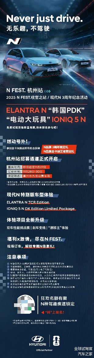 一周年,不止于回顾,更是新程的开启。11月22日至12月15日,现代N品牌体验中心将开启“N Week”。活动期间,用户进店完成试驾并分享至社交平台可获赠试驾礼包。通过官方直播间或实体店下单,还可享运动相机等专属购车礼遇。此外,进店注册会员并完成打卡或登记生日信息,即可参与扭蛋抽奖,惊喜好礼持续放送。未来,现代N品牌体验中心将继续凝聚“N号玩家”与热爱驾驶的消费者,让高性能文化植根于日常,让更多用户能切身感受到“Never just drive”的理念。