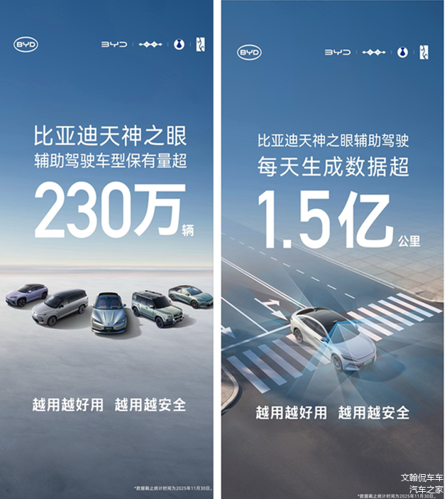 数据显示,截至2025年11月底,比亚迪搭载“天神之眼”驾驶辅助系统的车型累计销量已突破230万辆,持续蝉联中国辅助驾驶车型销量及系统装车量榜首。这标志着比亚迪推动的“全民智驾”战略已取得显著成效,智能驾驶正从高端配置加速向主流市场普及。