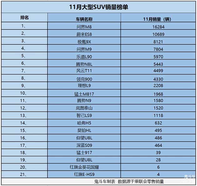 现在,国产品牌不断向这一细分市场加推新车,他们在产品力上进行全面调整,很多车型上演“后来者居上”的戏码。销量就是最好的证明,日前,乘联会发布11月零售销量数据,鬼哥整理出11月大型SUV销量榜单,结果发现,仅有两款车型销量超过万辆,接下来,看看具体车型排名与销量表现。